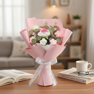 Handmade Crochet Rose Flower in White Textured Pot – Permanent Bloom Gift