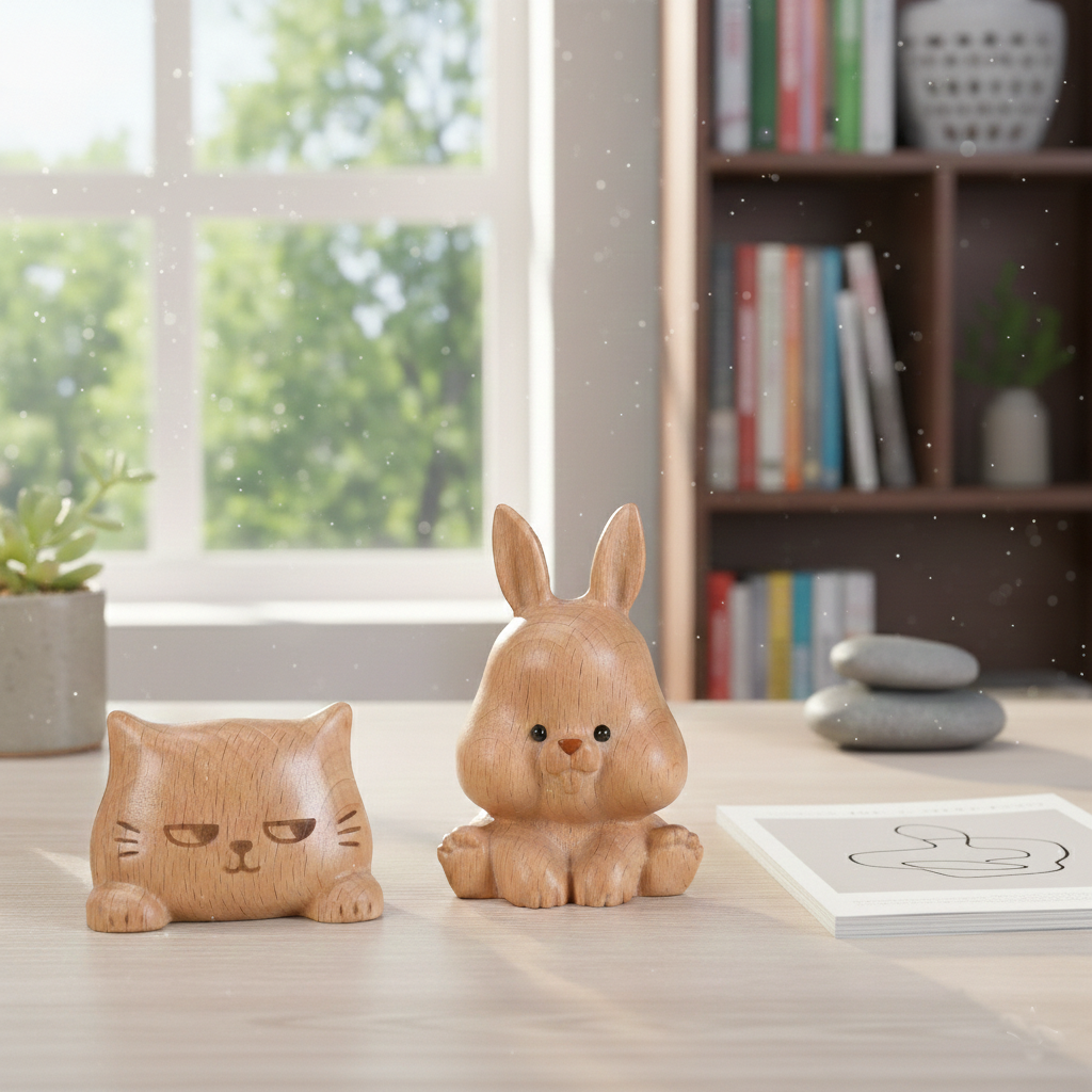 Applications: These solid wood figurines function as desktop decor for home, office, and study environments.