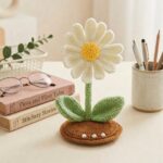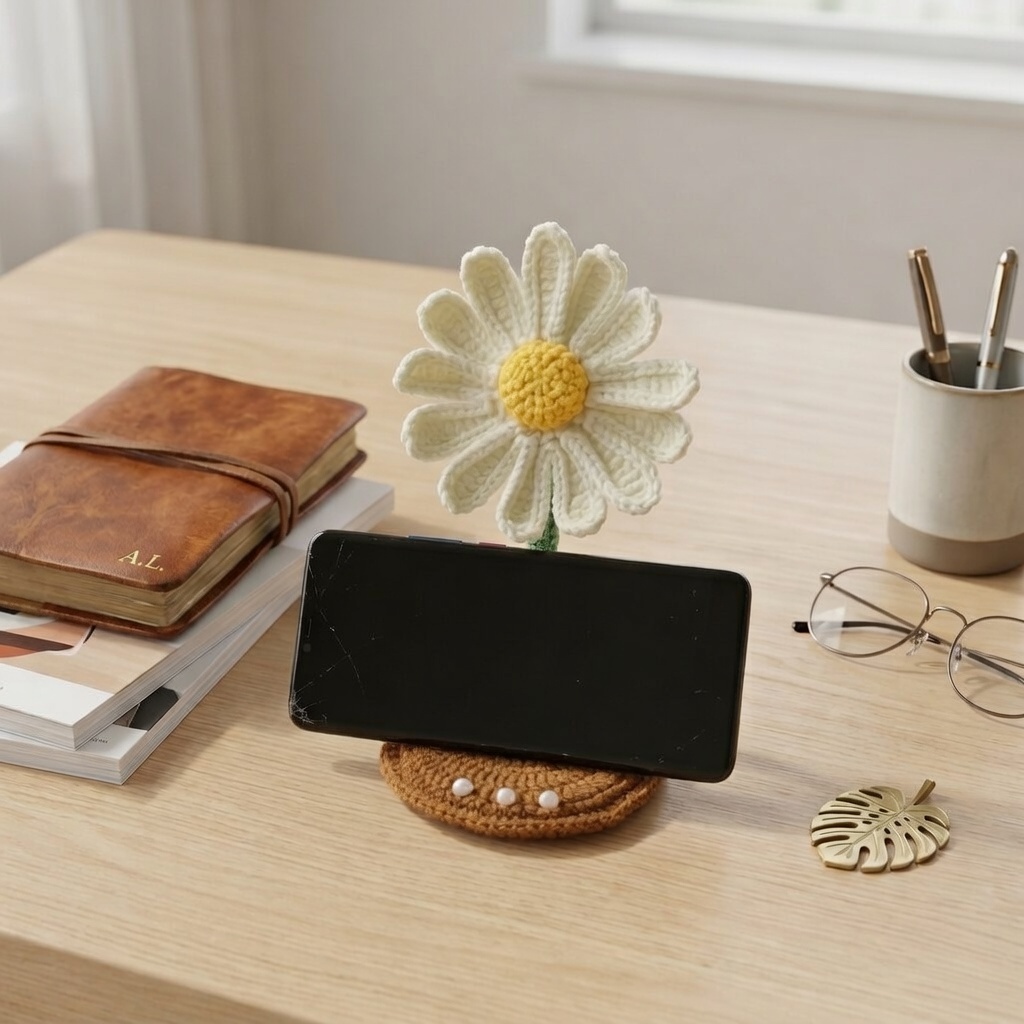 Handmade Crochet Daisy Phone Stand – White & Yellow Amigurumi Flower Desktop Cell Phone Holder for Office & Home Decor