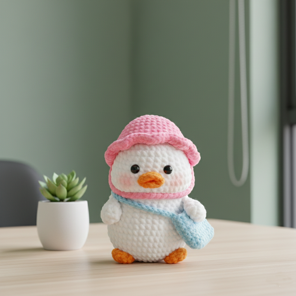 Featuring bright yellow and charming pink bucket hats, these soft cartoon knit toys have endearing little orange beaks, sweet rosy cheeks, and carry a tiny blue messenger bag, making them look ready for any adventure! They are sure to bring a smile to anyone who sees them.