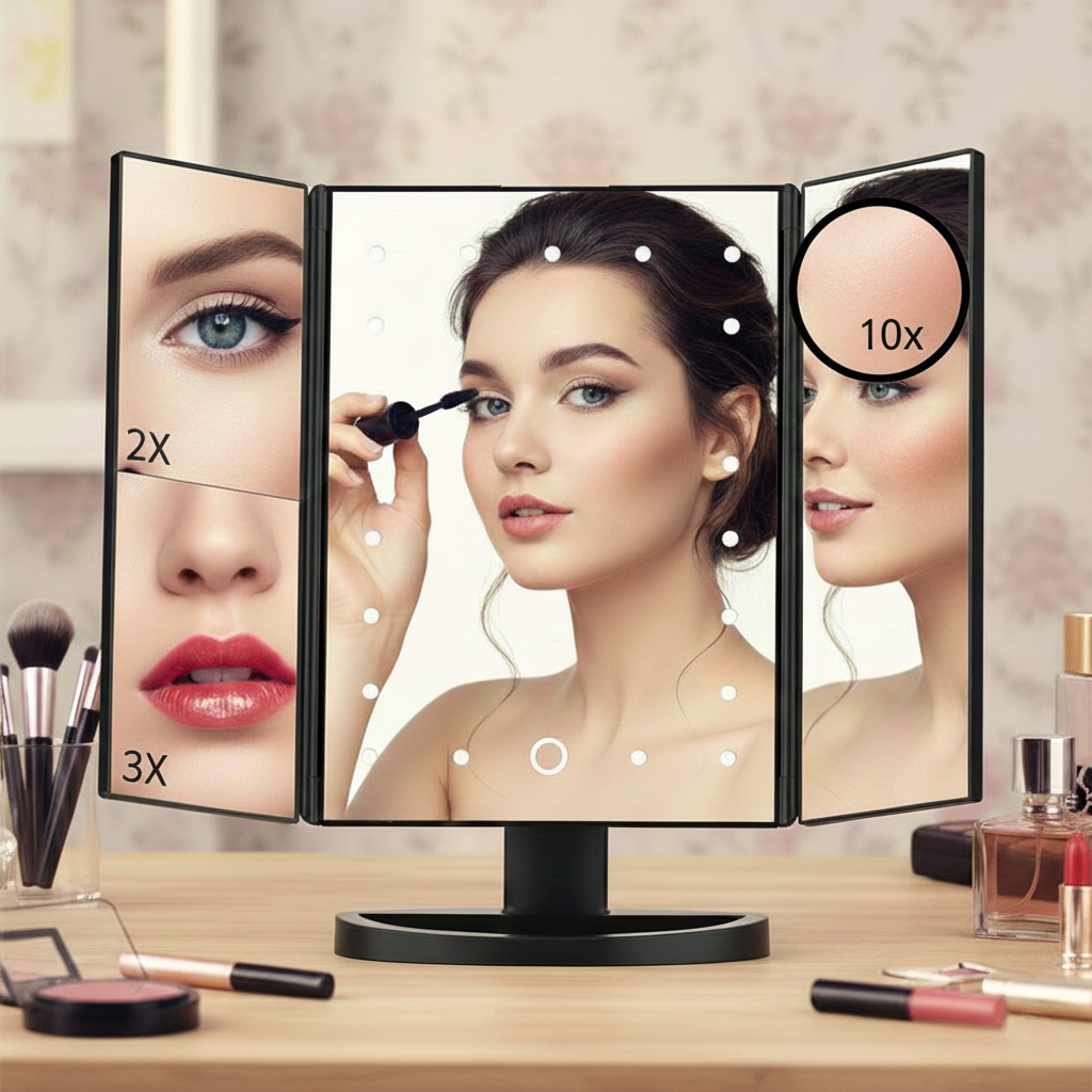 Elevate your beauty routine with the ultimate tool for flawless makeup application—the Tri-Fold LED Makeup Mirror. Designed with precision and versatility in mind, this lighted vanity mirror is a must-have for makeup artists, beauty enthusiasts, and anyone seeking a perfect, detailed look.